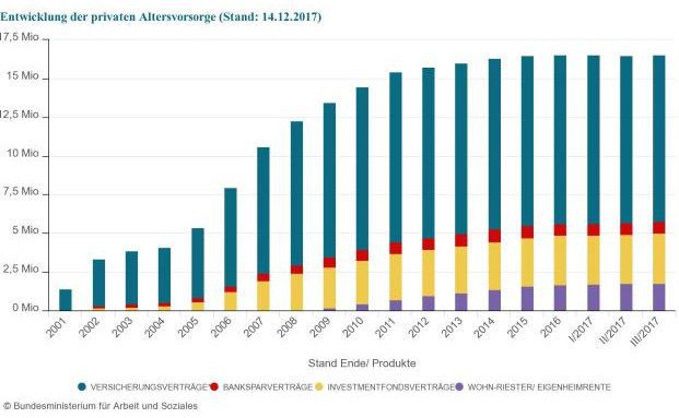 Zuletzt hat sich die Zahl der Riester-Versicherungsverträge hierzulande etwas verringert: Waren es im zweiten Quartal dieses Jahres noch 10,82 Millionen Stück, sank dieser Wert im dritten Vierteljahr auf 10,79 Millionen (Stand: 14.12.2017). Das zeigt eine aktuelle Statistik des Bundesministeriums für Arbeit und Soziales.