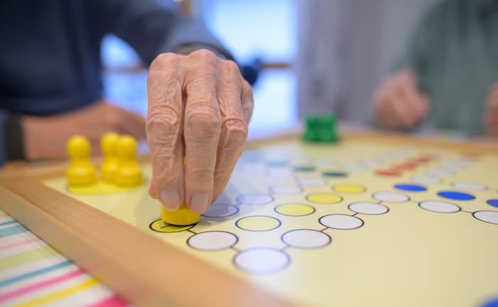Und raus bist du! Zwei Männer spielen in einer Seniorengruppe für Menschen mit Behinderung das Spiel „Mensch ärgere Dich nicht“. Senioren gelten in Deutschland zunehmend als armutsgefährdet.