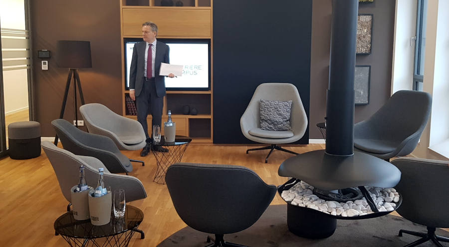 Swiss Life hat einige Vertreter der Presse dorthin eingeladen, damit sie den (Noch-)Deutschland-Chef Jörg Arnold ausfragen können. Das Gespräch läuft im Kaminzimmer, einem hellen Raum mit Bar und Tresen und zentral gelegener kleiner Feuerstelle mit Abzug. Ohne die Finger hineinzuhalten ist es schwer zu sagen, ob die Flammen echt sind. Doch das ist ohnehin nicht das Thema.