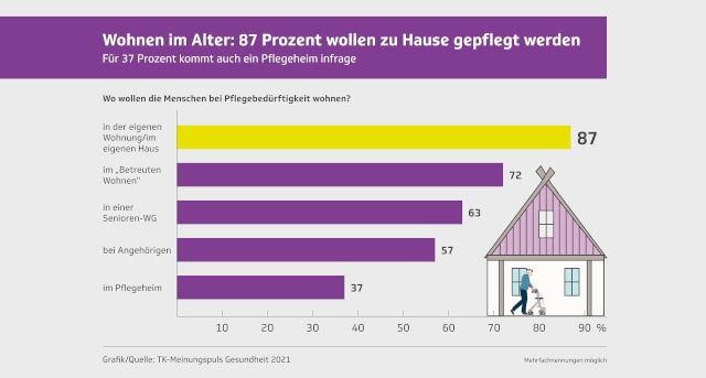 Im Fall einer Pflegebedürftigkeit ziehen 87 Prozent der Deutschen es vor, sofern möglich, zuhause betreut zu werden. Zu diesem Ergebniss gelangt die aktuelle Studie „TK-Meinungspuls 2021“ der Techniker Krankenkasse (TK). Für 72 Prozent kommt demnach direkt danach ein betreutes Wohnen in Betracht (siehe Grafik). 63 Prozent können sich eine Senioren-Wohngemeinschaft vorstellen. 57 Prozent würden gern bei Angehörigen gepflegt werden und nur etwas mehr als ein Drittel möchte in ein Pflegeheim.