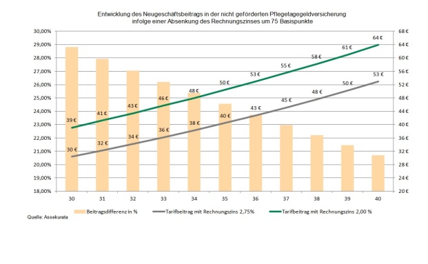 Gerade in der Pflegeversicherung werde das deutliche Auswirkungen haben, zeigt ein Rechenbeispiel. Der Grund sei vor allem der lange Anlageprozess der Policen. So müsste ein 30-Jähriger bei einer Absenkung des Rechnungszinses von 2,75 auf 2,00 Prozent bei einem Neuabschluss für den gleichen Tarif rund 30 Prozent mehr zahlen. In absoluten Zahlen liege der Beitragsunterschied zwar nur bei 9 Euro monatlich. Auf Jahrzehnte gesehen läppert sich das aber natürlich.