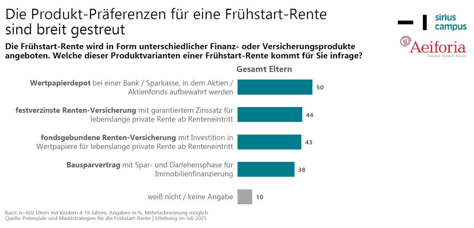 Das geht aus der Studie „Potenzial und Marktstrategien für die Frühstart-Rente“ hervor, die Sirius Campus zusammen mit dem Beratungsunternehmen Aeiforia herausgegeben hat. Die repräsentative Online-Erhebung fand im Juli 2025 unter 802 Eltern mit Kindern im Alter zwischen 4 und 16 Jahren statt.