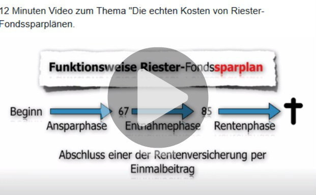 Riester-Rentenversicherungen stehen bei Verbraucherschützern immer wieder wegen ihrer hohen Kosten in der Kritik. Als Alternative nennen sie unter anderem Riester-Fondssparpläne. Sind diese aber wirklich kostengünstiger? Riester-Experte Joachim Haid klärt in einem Video über die wirklichen Kosten von Riester-Fonds auf.