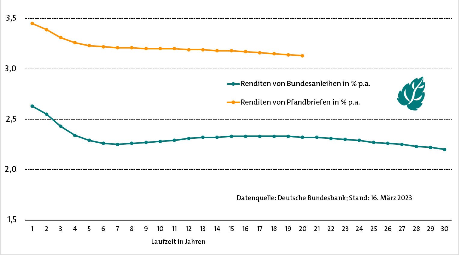 Der Markt für Immobilienkredite hängt direkt am Markt für Pfandbriefe. Das sind spezielle Anleihen, die Pfandbrief- oder Hypothekenbanken ausgeben, mit Grundschulden oder Hypotheken besichern und sich so am Markt Geld holen. Dafür müssen sie Zinsen beziehungsweise Renditen zahlen (wenn man den Ausgabekurs mit berücksichtigt), die sich stark an Bundesanleihen orientieren, aber einen Renditeaufschlag enthalten. Den nennt man Spread, und er beträgt im langfristigen Durchschnitt ungefähr 0,4 Prozentpunkte (Quelle: Pfandbrief-Market.de).