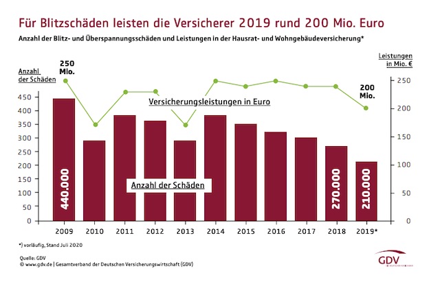 Die deutschen Hausrat- und Wohngebäudeversicherer haben 2019 für Blitz- und Überspannungsschäden rund 200 Millionen Euro geleistet. Das ist der niedrigste Wert seit 2013 und 40 Millionen Euro weniger als ein Jahr zuvor. Die Zahl der Blitzschäden lag mit 210.000 auf dem niedrigsten Stand der vergangenen 20 Jahre.