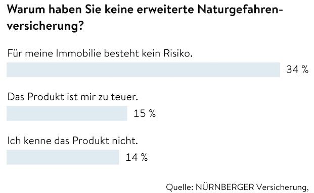 „Jeder Zweite denkt, dass die Wohngebäudeversicherung oder die Hausratversicherung Hochwasserschäden automatisch abdecken. Das stimmt allerdings nicht“, sagt Peter Meier, Vorstandsmitglied der Nürnberger Versicherung. „Gegen Schäden an der Immobilie und am Mobiliar durch Naturgewalten wie Überschwemmungen, Schneedruck oder Erdrutsch schützt nur die erweiterte Naturgefahrenversicherung, und zwar sowohl innerhalb der Wohngebäude-, als auch der Hausratversicherung.“