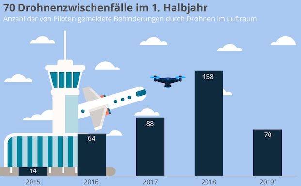 Drohnen erfreuen sich bei den Bundesbürgern wachsender Beliebtheit. Ganz ungefährlich sind die flotten Flugobjekte aber nicht. Alleine im ersten Halbjahr 2019 kam es in 70 Fällen zur Behinderung durch Drohnen im Luftraum.