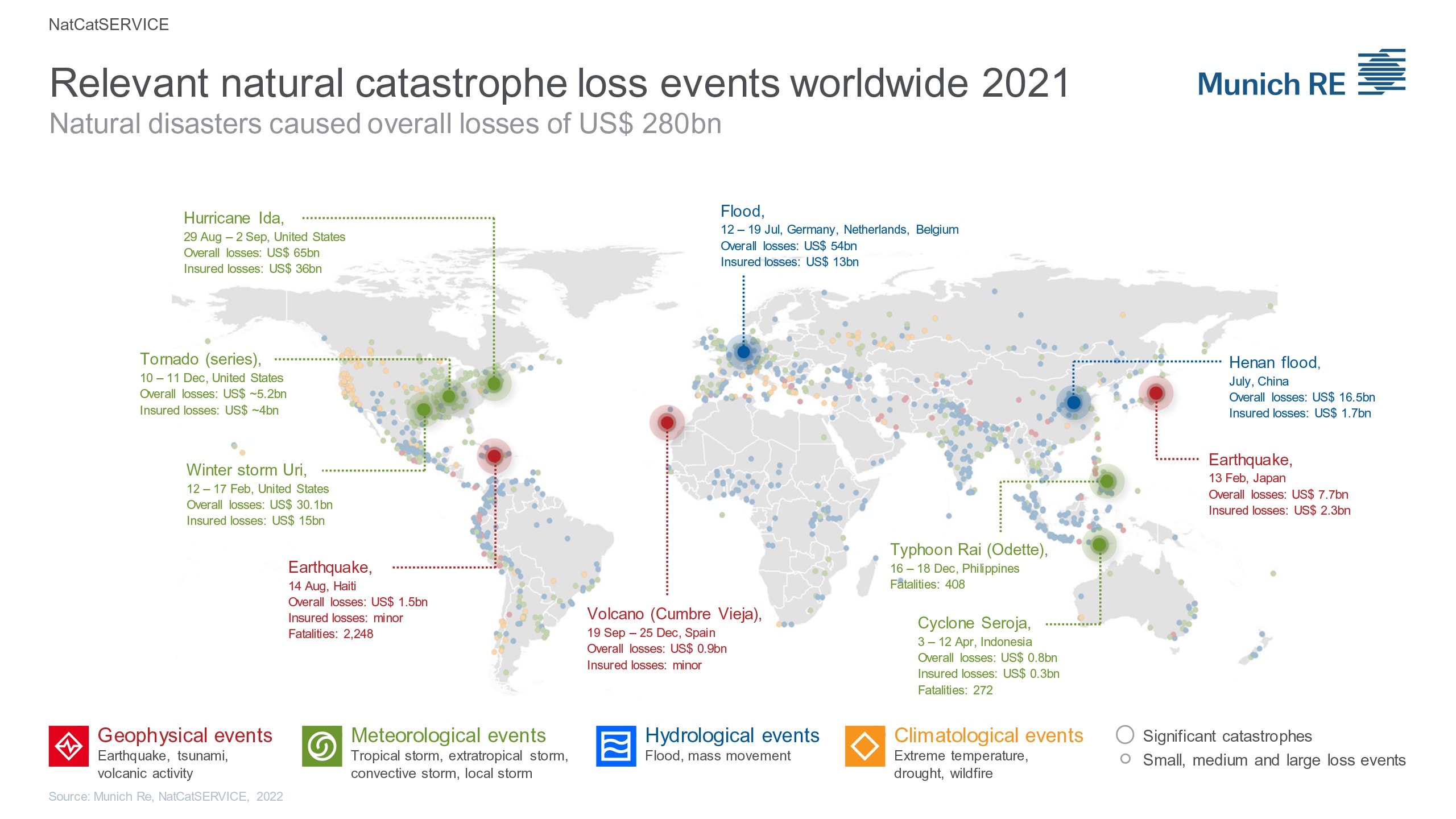 Insgesamt schätzt die Munich Re die Höhe aller Schäden aus dem vergangenen Jahr – also versicherte und nicht versicherte Schäden – auf 280 Milliarden US-Dollar (rund 247 Milliarden Euro). Ein sehr hoher Anteil davon entfiel auf die USA: rund 145 Milliarden US-Dollar (rund 128 Milliarden Euro). Davon waren etwa 85 Milliarden US-Dollar (rund 75 Milliarden Euro) versichert. Die Gesamtschäden und die versicherten Schäden lagen damit deutlich über denen der Vorjahre (Gesamtschäden 2020: 100 Milliarden US-Dollar, 2019: 52 Milliarden US-Dollar; versicherte Schäden 2020: 67 Milliarden US-Dollar, 2019: 26 Milliarden US-Dollar).