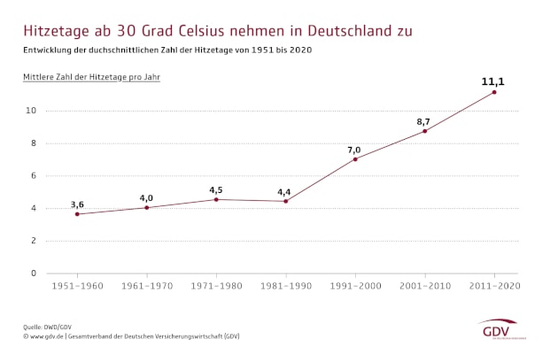 In den vergangenen zehn Jahren wurden bundesweit im Schnitt 11,1 Hitzetage jährlich gezählt. Das sind dreimal so viele wie noch in den 1950er Jahren. Das zeigt eine vom Gesamtverband der Deutschen Versicherungswirtschaft (GDV) in Auftrag gegebene Analyse von Daten des Deutschen Wetterdienstes (DWD).