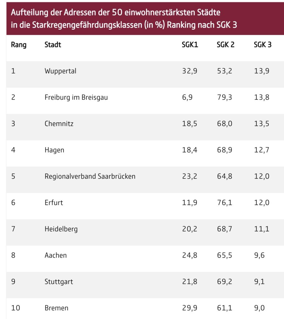 Die Stadt Wuppertal in NRW hat aufgrund ihrer geografischen Lage bundesweit die meisten Gebäude, die bei unwetterartigem Regen hoch gefährdet sind. Jedes siebte Haus steht hier in einem Tal oder in der Nähe eines kleineren Gewässers – und ist deshalb in die höchste Starkregengefährdungsklasse eingeordnet. In Kiel dagegen liegen nur 2,5 Prozent der Gebäude in der höchsten Gefährdungsklasse. Das zeigt ein Vergleich der 50 einwohnerstärksten Städte Deutschlands, den der Gesamtverband der Deutschen Versicherungswirtschaft (GDV) durchgeführt hat (siehe Grafik).