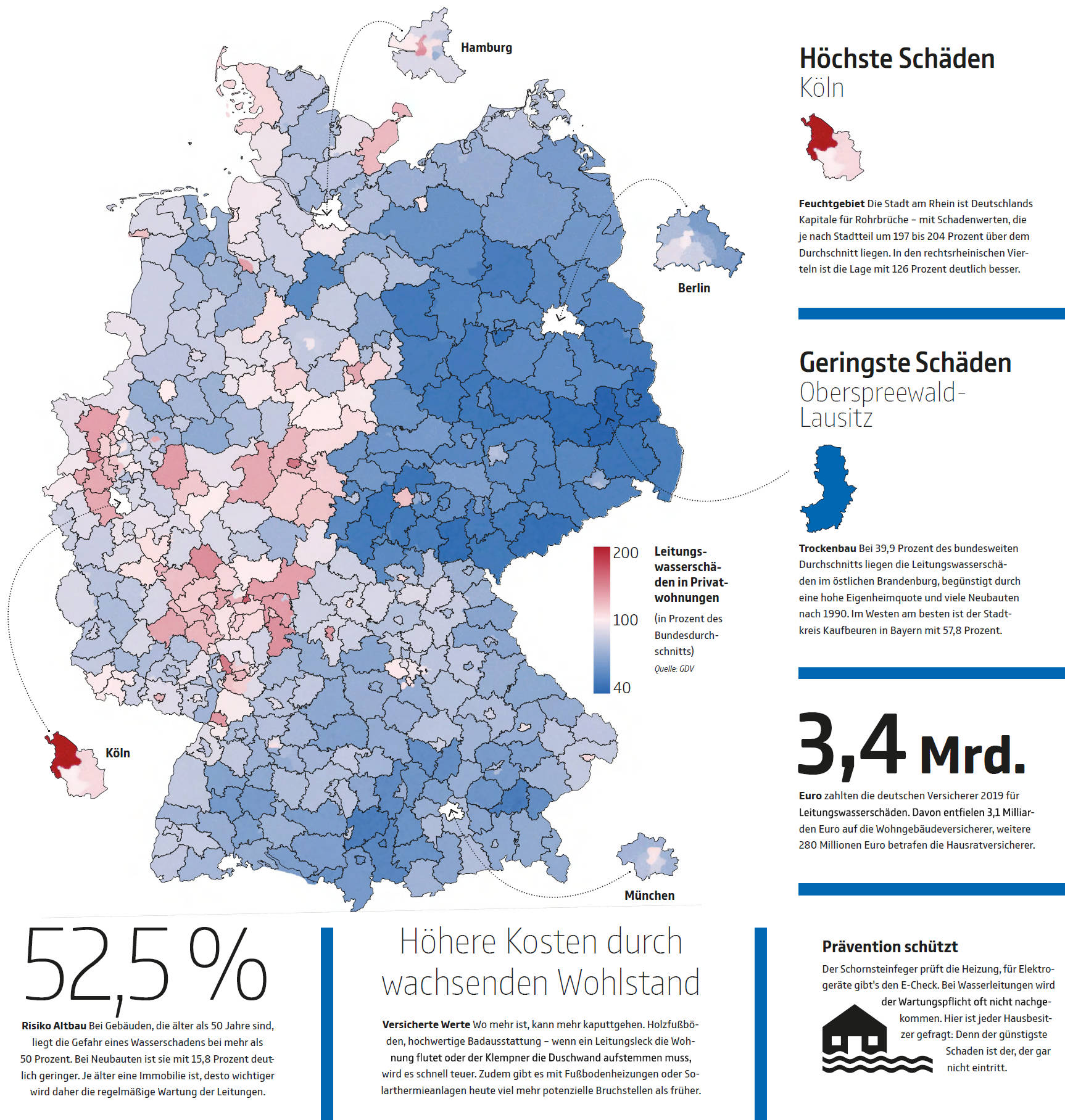 Wie sich das bundesweit äußert, hat wiederum der GDV ermittelt. Denn in der ehemaligen DDR, wo in den Neunzigerjahren massenhaft saniert und erneuert wurde, halten sich die Wasserschäden noch in Grenzen. Kunststück, schließlich sind die Rohre heute noch nicht mal 30 Jahre alt und halten dicht. Am besten schneidet das Gebiet Oberspreewald-Lausitz ab mit nur 40 Prozent der bundesweit durchschnittlichen Leitungsschäden. Das andere Extrem ist der nordwestliche Teil von Köln mit teilweise über 200 Prozent. Alte Stadt, alte Leitungen.