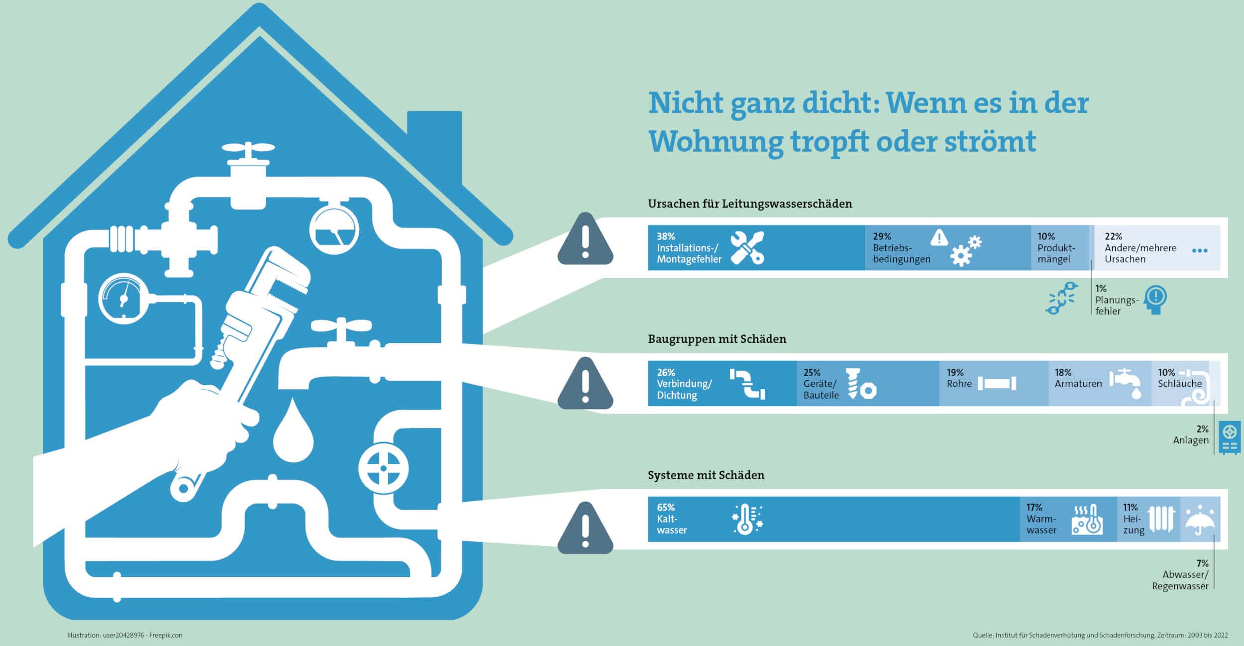 Den Fall schildert das Institut für Schadenverhütung und Schadenforschung (IFS), eine Institution der öffentlichen Versicherer. Er ist ein Beispiel dafür, dass Leitungswasserschäden nicht allzu oft am Material liegen, sondern eher daran, wie man es einbaut (siehe Grafik).